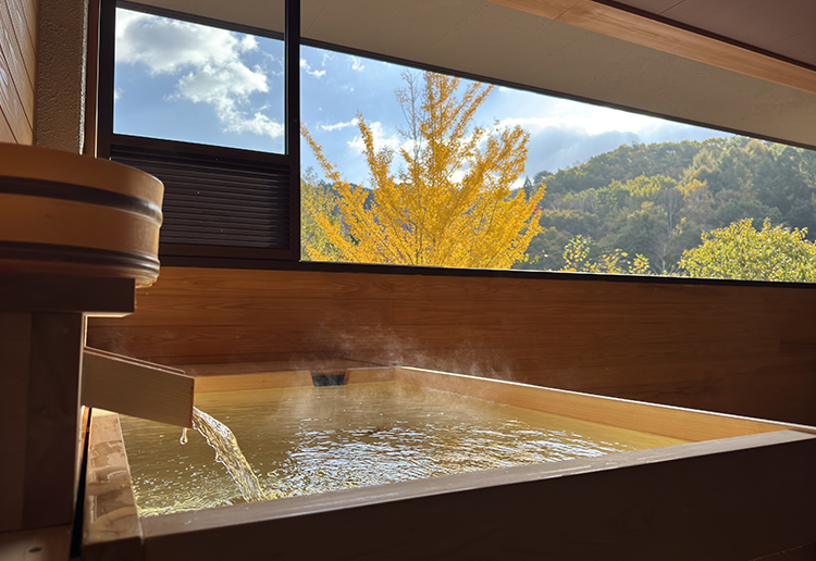 檜の露天風呂で、いつでも気兼ねなく自慢の天然温泉を満喫できます。露天風呂からは奥利根の大自然を堪能できます。